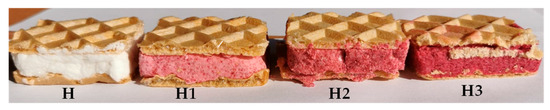 Nougat supplemented with beetroot skin powder: H—nougat without added beetroot skin powder; H1, H2, and H3—nougat formulas with the addition of 2, 4, and 6% (w/w) beetroot skin powder.