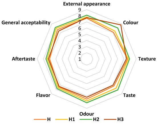Comparative diagram of the specific sensory attributes of the supplemented nougat samples: H—nougat without the addition of beetroot skin powder; H1, H2, and H3—supplemented nougat with the addition of 2, 4, and 6% beetroot skin powder.