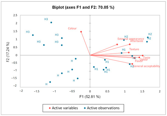 The biplot derived from PCA analysis (Figure 4) concisely represents the differences and correlations among the assessed sensory attributes and the batches of nougat supplemented with beetroot skin powder. The two axes account for 70.05% of the overall variation. Analyzing the PCA results, we can observe that sample H2 (the batch with 4% beetroot powder) emerged as the frontrunner regarding consumer preferences. The external appearance, color, aftertaste, and texture characteristics, located in the upper-right quadrant, were perceived by consumers as positive. Taste, odor, flavor, and general acceptability also positively contribute to axis F1, as with the color attribute.