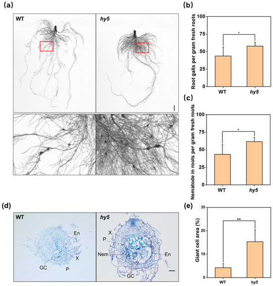 To further investigate the role of CsHY5 during RKN infection of cucumber, we carried out a sensitivity evaluation at 14 DAI after infection, and the results showed that the number of galls in the roots of Cshy5 mutant plants was significantly higher than that of WT plants at 14 DAI. The number of total nematodes in the roots exhibited the same trend (Figure 3a–c). Through the sensitivity evaluation, we found that the deficiency of CsHY5 decreased the resistance of cucumber to RKNs, which was confirmed by the important role of CsHY5 in the response of cucumber to RKN infection, whether it was the J2 invasion at the early stage of infection (7 DAI), or the number of galls and nematodes in the root at 7 and 14 DAI. When comparing the root knot morphology in WT and Cshy5 roots, we observed that most of the root knots appeared larger in Cshy5 roots. To better explain this phenomenon, we examined the anatomical structure of the root knots of the two, and we could clearly see that there were more giant cells in the root knots of Cshy5 and they occupied a larger area in the whole section at 7 (Figure S4a,b), 14 (Figure 3d,e), and 21 DAI (Figure S4c,d). The absolute counts of gall numbers and total nematodes in the root systems demonstrate that the loss of CsHY5 increases plant susceptibility to nematode infection (Figures S1 and S2).
