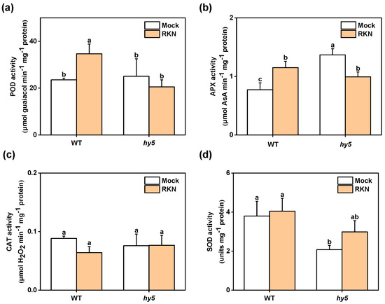 Given the crucial roles of hormones and ROS in plant defense against RKNs, we further collected leaves from Cshy5 mutants and WT plants that were either infected or non-infected with RKNs at 21 DAI. We then measured the activities of four antioxidant enzymes: POD, APX, CAT, and SOD (Figure 6). By analysis, it was found that POD enzyme activity was induced in WT but not in Cshy5 mutants (Figure 6a). The APX enzyme activity was similarly induced in WT, while it was significantly decreased in Cshy5 mutants (Figure 6b). Interestingly, the CAT enzyme activity was still not induced in Cshy5 mutants during RKN infection but showed a significant downward trend in WT (Figure 6c). However, SOD activity could not be induced in either Cshy5 mutants or WT (Figure 6d). Surprisingly, the activities of these three enzymes (POD, CAT, and SOD) were not induced in Cshy5 mutants during the RKN challenge. Moreover, the CAT enzyme activity in WT, as well as APX enzyme activity in Cshy5 mutants, was not induced during nematode attack on plants, but showed a downward trend. Taken together, we can determine that antioxidant enzymes are involved in plant defense during nematode infection in cucumber and are not activated in mutants.