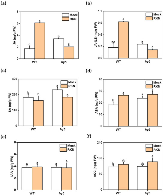 The effect of RKNs on leaf hormones in cucumber after infection. (a–f) The contents of JA, JA-Ile, SA, ABA, IAA, and ACC hormones associated with RKN defense in leaves of infected and non-infected WT and Cshy5 mutants 7 days after RKN infection. The results are presented as the mean ± SD; n = 3. Different letters indicate significant differences (p < 0.05) according to Tukey’s test.