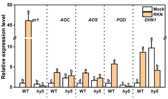 In order to disclose the functional mechanism of these genes, GO and KEGG enrichment analyses were carried out on the genes in these six regions (Figure 8b,c). In the GO enrichment analysis, these genes were enriched in terms of hormone-mediated signaling pathway, response to hormone and phenylalanine ammonia lyase activity. The KEGG enrichment analysis indicated that these genes were enriched in pathways like the MAPK signaling pathway-plant, alpha-Linolenic acid metabolism, Linoleic acid metabolism, Phenylpropanoid biosynthesis, Peroxisome, Plant–pathogen interaction, and others. Based on the GO and KEGG enrichment results, the expression of some genes related to the response to wounding and the response to oxidative stress, and hormones were listed with heat maps (Figure 8d). To validate the reliability of the transcriptome results, we chose several key genes related to the plant’s resistance to RKNs and verified them through qRT-PCR. These included JA key synthase genes CsaV3_5G023060 (AOC) and CsaV3_2G028330 (AOS), the ABA-responsive gene CsaV3_4G005460 (DHN1), the POD enzyme gene CsaV3_4G023590, and the pathogenesis-related protein gene CsaV3_7G007620 (PR1). The results were consistent with the trends of the transcriptome data (Figure 8d), indicating the high reliability of the transcriptome results (Figure 9). Based on the transcriptome data, it can be determined that the loss of CsHY5 during RKN infection affects the transmission of infection signals and the response of the defense response.