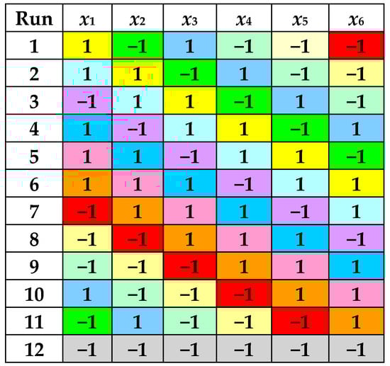 Levels of dimensionless factors in the PBD with 6 factors and 12 experimental runs.