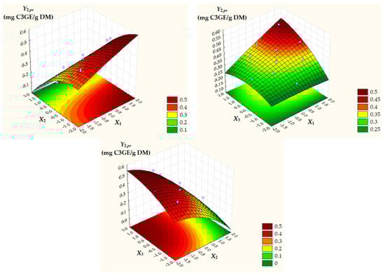 Surface and contour plots of Y2,pr = TACpr depending on dimensionless process factors; X1, liquid/solid ratio; X2, ethanol concentration; X3, extraction temperature.