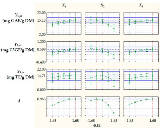 Predicted values of process response variables (Y1,pr = TPCpr, Y2,pr = TACpr, and Y3,pr = ACpr) and desirability function (d) at different levels of dimensionless process factors; X1, liquid/solid ratio; X2, ethanol concentration; X3, extraction temperature.