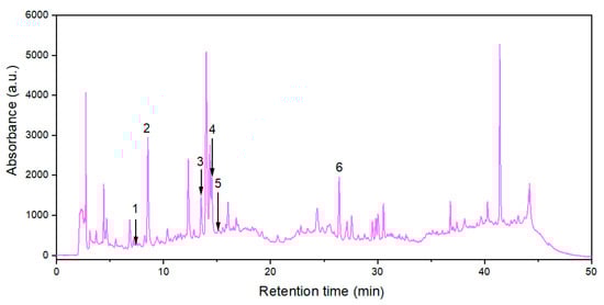 HPLC chromatogram (at 330 nm) for the extract obtained under optimal conditions: (1) protocatechuic acid; (2) neochlorogenic acid; (3) chlorogenic acid; (4) caffeic acid; (5) vanillic acid; (6) rutin.