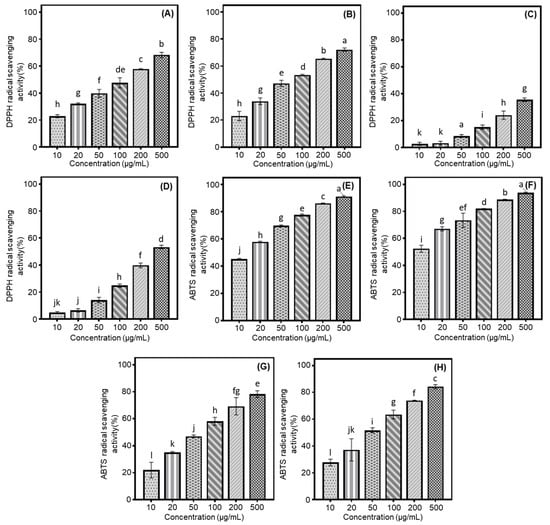 Comparison of soybean cultivars with the radical scavenging activity of four usage categories using different concentrations of 50% methanol extracts. (A) DPPH radical scavenging effects of bean paste soybean (cv. Shinpaldal 2); (B) DPPH radical scavenging effects of bean sprout soybean (cv. Sorog); (C) DPPH radical scavenging effects of vegetable soybean (cv. Hwaeomput); (D) DPPH radical scavenging effects of cooked-with-rice soybean (cv. Cheongdu 1); (E) ABTS radical scavenging effects of bean paste soybean (cv. Shinpaldal 2); (F) ABTS radical scavenging effects of bean sprout soybean (cv. Sorog); (G) ABTS radical scavenging effects of vegetable soybean (cv. Hwaeomput); (H) ABTS radical scavenging effects of cooked-with-rice soybean (cv. Cheongdu 1). All values are expressed as the mean ± standard deviation of triplicate measurements, and different letters in the graph indicate significant differences at the 0.05 level of Tukey’s HSD-ANOVA multiple range test between usage categories to concentrations (p ≤ 0.05).