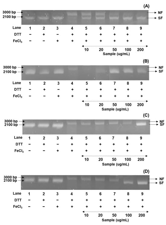Comparison of soybean cultivars with the DNA protectant effects of four usage categories using different concentrations of 50% methanol extracts. (A) Bean paste soybean (cv. Shinpaldal 2); (B) bean sprout soybean (cv. Sorog); (C) vegetable soybean (cv. Hwaeomput); and (D) cooked-with-rice soybean (cv. Cheongdu 1). Lane 1, pUC18 only; lane 2, pUC18 with DDT only; lane 3, pUC18 with FeCl3 only; lane 4, pUC18 with MCO system; lane 5–9, pUC18 with combinant extracts in the MCO system (lane 5: 10 μg/mL; lane 6: 20 μg/mL; lane 7: 50 μg/mL; lane 8: 100 μg/mL; and lane 9: 200 μg/mL).