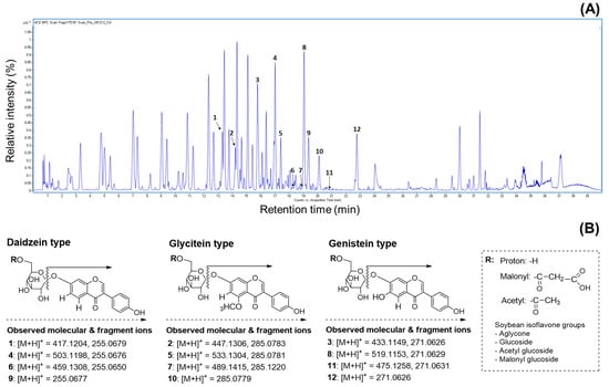 The 50% methanol extract of cultivated soybean was analyzed using a UPLC-Q-TOF-MS/MS system for the identification of isoflavones [,]. The UPLC system was equipped with a vacuum degasser, a binary pump, and automatic sampler and coupled to a quadrupole time-of-flight mass spectrometer operating in positive electrospray ionization mode. A sample (5 μL) was injected into an analytical reverse phase C18 column (Phenomenex Kinetex EVO C18, 100 mm × 2.1 mm, 2.6 μm, Torrance, CA, USA) with a flow rate of 0.2 mL/min. The mobile phase consisted of solvent A (water) and solvent B (0.1% formic acid in CH3CN), with the gradient conditions of 0–2 min, 3% B; 10 min, 10% B; 30 min, 40% B; 40 min, 95% B, and was then held for 3 min before returning to the initial conditions. The column temperature was set at 25 °C. Mass spectrometric analysis was performed as m/z 0–600. The detailed mass spectrometry conditions were as follows: ion source, Dual AJS ESI; gas temperature, 300 °C; gas flow, 9 L/min; nebulizer pressure, 35 psi; sheath gas temperature, 350 °C; sheath gas flow, 11 L/min; capillary voltage, 4000 V; nozzle voltage, 500 V; octupole RF, 750 V; fragmentor voltage, 175 V; skimmer voltage, 45 V; MS scan rate, 5 spectrals; MS/MS scan rate, 3 spectrals; and collision energy, 40 eV. Data acquisition, peak integration, and isoflavone identification were conducted using MassHunter Qualitative Analysis Software B 8.00 (Agilent Technologies, Co., Santa Clara, CA, USA).