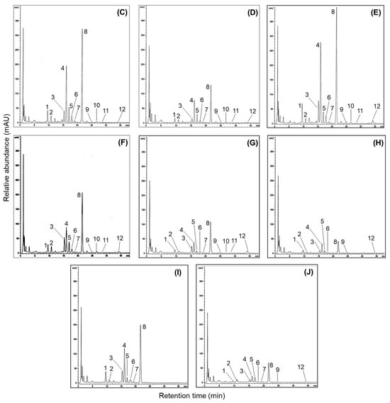 Representative base peak chromatogram and mass fragmentation patterns regarding isoflavone derivatives in the 50% methanol extract of soybean (cv. Sorog) obtained by UPLC-Q-TOF-MS in positive ion mode, and comparison of HPLC chromatograms for 12 isoflavone derivatives in the 50% methanol extracts of soybean cultivars with the highest and the lowest isoflavones in four usage categories. (A) UPLC-Q-TOF-MS chromatogram using positive ion mode. Peak 1: daidzin; peak 2: glycitin; peak 3: genistin; peak 4: malonyldaidzin; peak 5: malonylglycitin; peak 6: acetyldaidzin; peak 7: acetylglycitin; peak 8: maloylgenistin; peak 9: daidzein; peak 10: glycitein; peak 11: acetylgenistin; peak 12: genistein. (B) Mass fragmentation patterns of isoflavone compositions; (C) Shinpaldal 2; (D) Daewon; (E) Sorog; (F) Bukwang; (G) Hwaeomput; (H) Hwasonput; (I) Cheongdu 1; and (J) Seonheuk.