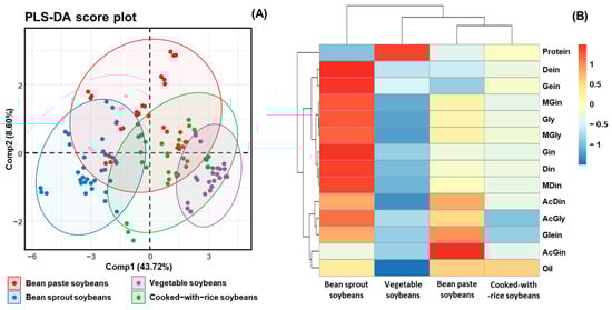 Score plot of PLS-DA and heatmap analysis of metabolites (protein, oil, and isoflavone) for 41 soybean cultivars in four usage categories. (A) Score plot of PLS-DA of four soybean usage categories; and (B) hierarchical clustering and heatmap analysis to investigate the variable metabolites’ relationships, either positive (red) or negative (blue).