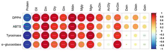 Pearson correlations between metabolites (protein, oil, and isoflavone) and biological activities for soybean cultivars in four usage categories. Red–blue colors represent positive and negative correlations. *, p < 0.05; ** p < 0.01; and *** p < 0.001.