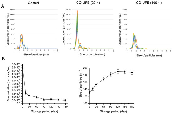 Ultrafine bubble (UFB) measurements. (A) Number and distribution of nanoparticles in the culture medium by NanoSight. The different colors represent five independent measurements. (B) Fluctuations in the UFB concentration or size in the retention period. Fluctuations in the UFB concentration or size are shown for a period of 6 months. Each circle or bar indicates the mean or standard deviation on days 1, 14, 30, 60, 90, 120, 150, and 180. CO-UFB: carbon monoxide-ultrafine bubble.