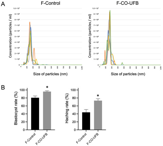 (A) Number and distribution of nanoparticles in the culture medium by NanoSight in the culture medium after filtration. The different colors represent five independent measurements. (B) Blastocyst and hatching rates of in vitro-produced mouse embryos with F-CO-UFB medium. The mean percentage was calculated from three independent experiments. n = 150 per group. Data are presented as the mean ± standard error. * p < 0.05 vs. F-Control. F-Control: control medium with filtration. F-CO-UFB: carbon monoxide ultrafine bubble medium with filtration.