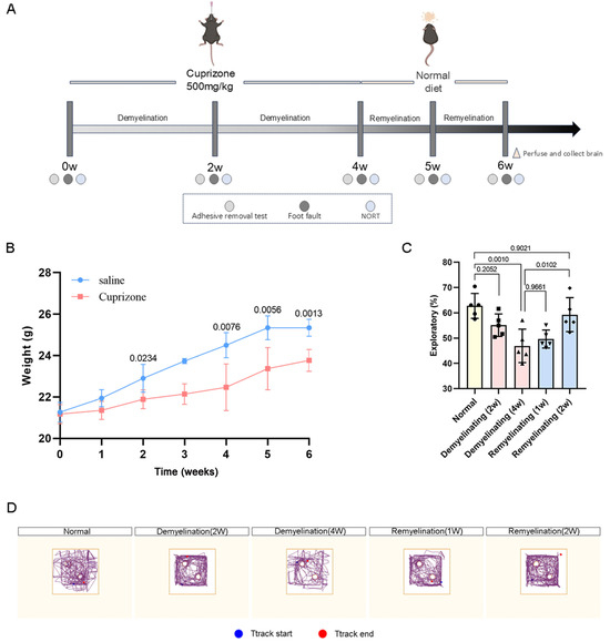 Figure 1. Alterations in sensorimotor and cognitive functions across demyelination and remyelination in cuprizone-induced mouse model. (A) Experimental timeline of cuprizone-induced mouse model. (B) Body weight measurements of cuprizone-administered mice at various time points. (C) Evaluation of short-term memory changes during demyelination and remyelination via novel object recognition test (NOR). (D) Behavioral trajectory plots. All p values were calculated via one-way ANOVA, followed by Tukey’s multiple comparison test.