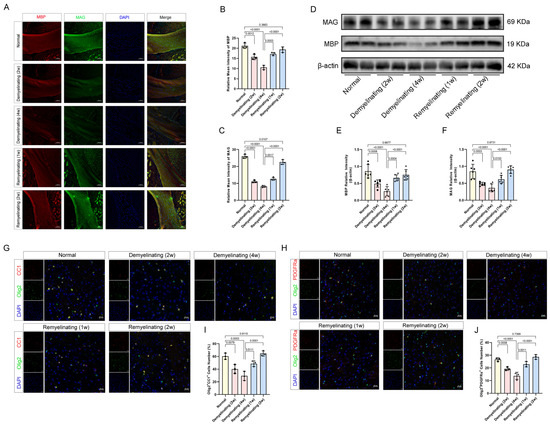 Figure 2. Cuprizone-induced demyelination. (A) Representative immunofluorescence images of MBP (red) and MAG (green) in corpus callosum at different time points during demyelination and remyelination (scale bar: 100 µm). (B,C) Quantitative analysis of MBP and MAG relative intensities. (D) Western blot showing changes in MBP and MAG protein expression. (E,F) Quantitative analysis of the ratios of MBP/β-actin and MAG/β-actin from Western blot images. (G) Representative immunofluorescence images of CC1 (red) and Olig2 (green) in the corpus callosum at different time points during demyelination and remyelination (scale bar: 20 µm). (H) Representative immunofluorescence images of PDGFRα (red) and Olig2 (green) in the corpus callosum at different time points during demyelination and remyelination (scale bar: 20 µm). (I) Normalized percentage of CC1+Olig2+ cells relative to the total Olig2+ population. (J) Normalized percentage of PDGFRα+Olig2+ cells relative to the total Olig2+ population. All p values were calculated via a one-way ANOVA, followed by Tukey’s multiple comparison test.