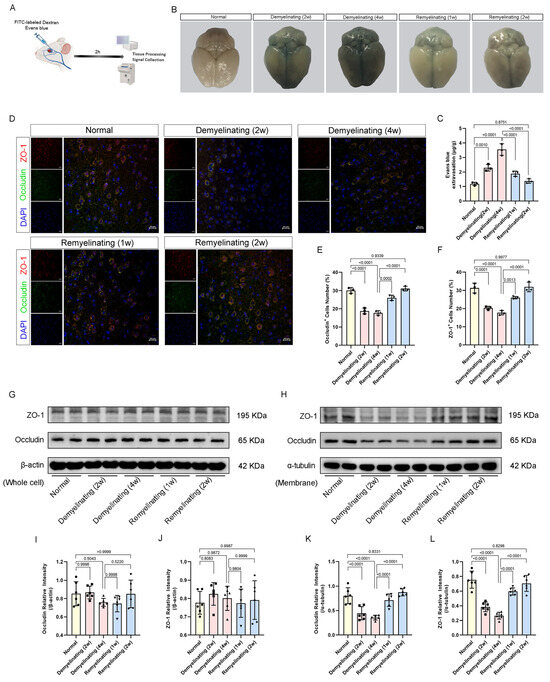 Figure 3. Effects of cuprizone on BBB permeability in mice. (A) Schematic of Evans blue and FITC–dextran injection in deeply anesthetized mice at different time points. (B) Representative images of EB leakage in brain tissues during demyelination and remyelination phases. (C) Quantitative analysis of EB leakage. (D) Representative immunofluorescence images of ZO-1 (red) and Occludin (green) in the corpus callosum at different time points during demyelination and remyelination (scale bar: 20 µm). (E,F) Normalized percentages of ZO-1+ and Occludin+ cells relative to the total cell population. (G) Western blot analysis of ZO-1 and Occludin protein levels in total cell lysates. (H) Western blot analysis of ZO-1 and Occludin protein levels in membrane fractions. (I,J) Quantitative analysis of ZO-1/β-actin and Occludin/β-actin ratios from Western blot images. (K,L) Quantitative analysis of ZO-1/α-tubulin and Occludin/α-tubulin ratios from Western blot images. Schematic illustrations (A) were created via BioRender (https://app.biorender.com/illustrations (accessed on 15 October 2024)). All p values were calculated via a one-way ANOVA, followed by Tukey’s multiple comparison test.