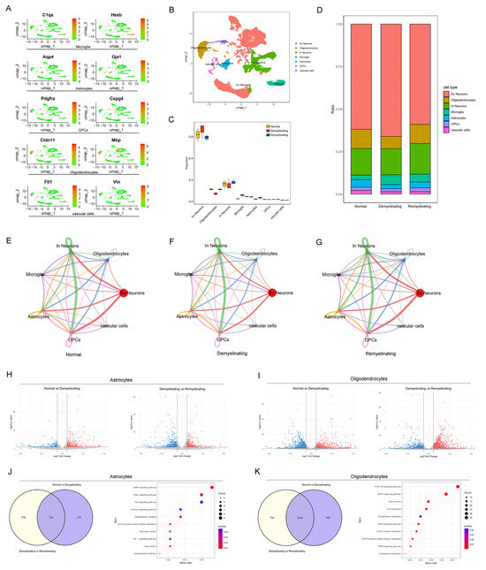 Figure 4. scRNA-seq analysis of the corpus callosum (CC) and cortex. (A) Scatter plot showing the distribution of the marker gene expression levels in microglia, astrocytes, OPCs, and oligodendrocytes. (B) UMAP plot of the scRNA-seq data. (C,D) Proportions of each cell type during demyelination and remyelination. (E) Receptor–ligand pair counts between different cell populations in normal mice. (F) Receptor–ligand pair counts between different cell populations in demyelinated mice. (G) Receptor–ligand pair counts between different cell populations in remyelinated mice. (I,J) Volcano plot displaying DEGs in astrocytes and oligodendrocytes. p values were calculated via the Wilcoxon rank-sum test. (H) Venn diagram showing overlapping DEGs between normal vs. demyelinated and demyelinated vs. remyelinated astrocytes, along with (J) a bar plot of significantly enriched biological pathways for overlapping genes. (I) Venn diagram showing overlapping DEGs between OLs (normal vs. demyelinated) and oligodendrocytes (demyelinated vs. remyelinated), along with (K) a bar plot of the significantly enriched biological pathways for the overlapping genes.