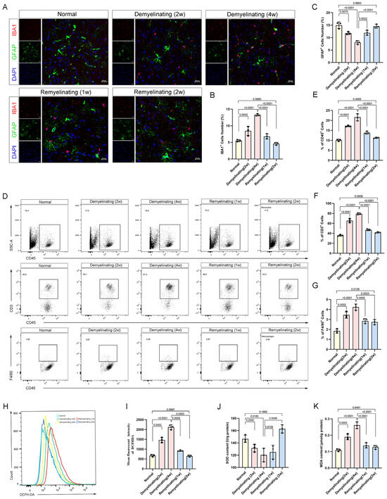 Figure 5. Cuprizone-induced neuroinflammation and immune infiltration. (A) Representative immunofluorescence images of IBA1 (red) and GFAP (green) in the cortical region at different time points during demyelination and remyelination (scale bar: 20 µm). (B,C) Normalized percentages of IBA1+ and GFAP+ cells relative to the total cell population. (D) Representative flow cytometry gate strategy for quantifying CD45 (E), CD3 (F), and F4/80 (G) cell populations in the cortex and corpus callosum at different stages of demyelination and remyelination. (H,I) Flow cytometry analysis of ROS levels in the cortex and corpus callosum. The results of the quantitative analysis of the ROS generation are displayed as bar graphs. (J,K) Kit-based detection of SOD and MDA activity in the cortex and corpus callosum. All p values were calculated via a one-way ANOVA, followed by Tukey’s multiple comparison test.