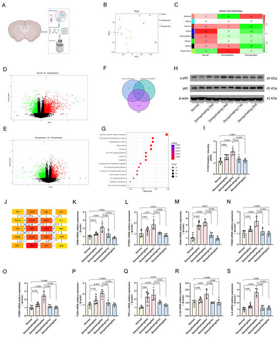 Figure 6. Bioinformatics analysis of transcriptomes in the cortex and corpus callosum. (A) Schematic of the experimental design for transcriptome sequencing. (B) Principal component analysis (PCA) plot illustrating the variability among biological replicates. (C) WGCNA identifies gene modules associated with demyelination and remyelination. The heatmap displays correlations and p values between modules and traits. (D) The volcano plot shows differentially expressed genes (DEGs) between the normal and deceased groups. p values were calculated via the Wilcoxon rank-sum test. (E) Volcano plot showing DEGs between the demyelinated and remyelinated groups. p values were calculated via the Wilcoxon rank-sum test. (F,G) Venn diagram illustrating overlapping DEGs between normal and demyelinated groups and demyelinated and remyelinated groups, with bar plots displaying significantly enriched biological pathways for overlapping genes. (H) Western blot analysis of p65 and p-p65 protein levels in total cell lysates. (I) Quantitative analysis of p65/p-p65 from Western blot images. (J) A protein-protein interaction (PPI) network was constructed via the STRING database, with hub genes identified via Cytoscape. (KP) qPCR validation of the mRNA expression levels of inflammation-related hub genes normalized to those of β-actin. (QS) qPCR validation of inflammatory cytokine mRNA expression levels normalized to those of β-actin. Schematic illustrations (A) were created via BioRender. All p values were calculated via a one-way ANOVA, followed by Tukey’s multiple comparison test.
