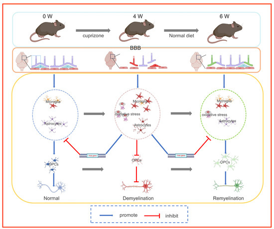 In summary, the cuprizone-induced demyelination model reveals a dynamic relationship between endogenous myelin regeneration and functional recovery (Figure 7). Sensorimotor and cognitive deficits correlate temporally with myelin loss, whereas the regeneration process partially reverses neurological dysfunction. Oligodendrocyte population reconstruction, particularly precursor cell differentiation, aligns with BBB integrity restoration and neuroinflammation resolution. Single-cell profiling revealed a coordinated cellular remodeling process, whereas transcriptomic analysis emphasized the dominance of inflammatory regulatory networks in driving the demyelination-repair cycle. The simultaneous alleviation of oxidative stress and immune infiltration during the remyelination phase further highlights the critical role of the microenvironment in regulating repair. These findings suggest that modulating neuroimmune interactions and enhancing endogenous repair mechanisms may provide novel therapeutic strategies for treating demyelinating diseases.