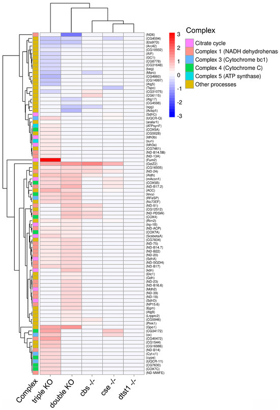Acute hydrogen sulfide deficiency in the double and triple-knockout strains can lead to chronic oxidative stress, which may affect mitochondrial function. Hydrogen sulfide plays central roles in mitochondrial homeostasis and function, and it is known that both an excess and deficiency of H2S may have deleterious effects at the cellular and organism levels [55,56,57]. We analyzed the transcription of genes related to mitochondrial function in the KO strains (e.g., Krebs cycle enzymes, respiratory chain components, ATP synthase, etc.).