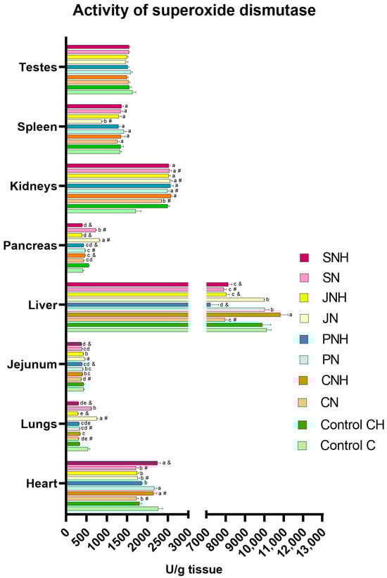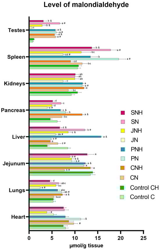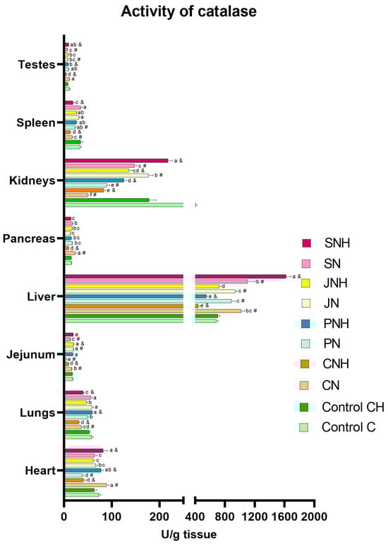 The one-way analysis comparing experimental groups CNH, PNH, JNH, and SNH to the control group CH indicated a significant reduction in SOD levels in the blood plasma of rats from the PNH, JNH, and SNH groups. Additionally, an increase in Cp levels in the blood plasma of the CNH and JNH groups was observed. Relative to the CH group, the levels of 3-NT and 8-OHdG in the blood plasma of rats from the PNH group were elevated. The MDA levels in the blood plasma increased in the JNH group but decreased in the SNH group compared to the control group (CH). Furthermore, blood samples collected from rats from the JNH and SNH groups exhibited higher PC levels than the CH group. There was also a reduction in the APE-1 level in the JNH group vs. the CH group, the OGG-1 level in the PNH and SNH groups vs. the CH group, and the CASP3 level in all experimental groups (CNH, PNH, JNH, and SNH) vs. the CH group (Table 2). MDA levels were higher in rats’ lungs, pancreas, and testes from the CNH group than in the rats from the control group (CH). Compared to the CH group, the MDA levels in the PNH group increased in the liver, pancreas, and testes but decreased in intestinal tissue. In the JNH group, rats exhibited increased MDA levels in the liver and testes while showing reduced levels in the heart and intestinal tissue relative to the control group (CH). In contrast, the SNH group demonstrated elevated MDA levels in the liver, spleen, and testes compared to the CH group (Figure 1; see Supplementary Materials—Table S1 for details). In the CNH group, increased SOD activity was noted in the heart; meanwhile, its activity was reduced in the pancreas compared to the control group (CH). Compared to the CH group, SOD activity in the PNH group decreased in the intestinal tissue, liver, and pancreas. Rats from the JNH group exhibited reduced SOD activity in the lungs, liver, and pancreas relative to the control group (CH). In turn, in the SNH group, SOD activity was increased in the heart but decreased in the lungs, intestinal tissue, liver, and pancreas (Figure 2; see Supplementary Materials—Table S2 for details). In the CNH group, CAT activity was reduced in the heart, lungs, intestinal tissue, liver, pancreas, kidneys, spleen, and testes relative to the control group (CH). Compared to the CH group, CAT activity in the PNH group increased in the heart, lungs, and testes, but its activity decreased in the liver and kidneys. In the JNH group, rats showed increased CAT activity in the intestinal tissue with reduced activity in the kidney compared to the CH group. The SNH group exhibited increased CAT activity in the heart, liver, and testes, while it decreased in the lungs, kidneys, and spleen compared to the CH group (Figure 3; see Supplementary Materials—Table S3 for details).