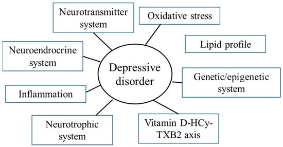 Systems involved in the pathophysiology of depressive disorder. HCy—homocysteine; TXB2—thromboxane B2.