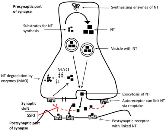 Neurotransmitters in the synapse. NT—neurotransmitter; MAO—monoamine oxidase; SSRI—selective serotonin reuptake inhibitor;