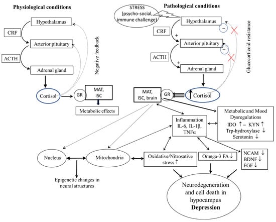 HPA axis and inflammation under physiological conditions and chronic stress. HPA—hypothalamic-pituitary-adrenal axis; CRF—corticotropin-releasing factor; ACTH—adrenocorticotropic hormone; GR—glucocorticoid receptor; IL-6—cytokine IL-6; IL-1β—interleukin-1β; TNF-α—tumor necrosis factor α; ISC—immune system cells; MAT—metabolically active tissue; NCAM—neural cell adhesion molecule; BDNF—brain-derived neurotrophic factor; FGF—fibroblast growth factor; IDO—indoleamine-2,3-dioxygenase; Trp—tryptophan; FA—fatty acids; KYN—kynurenine. The direction of the arrow means that one process/substance will affect another process/tissue. Modified according to [35].