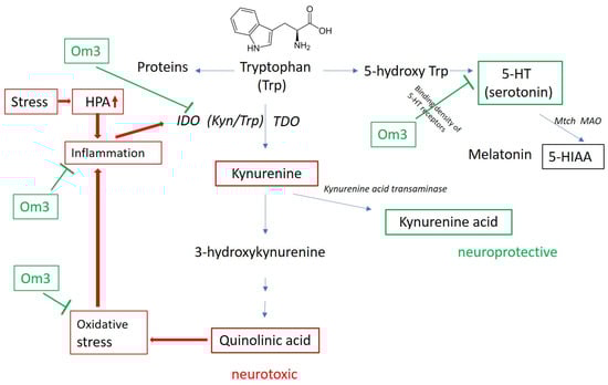 Catabolism of tryptophan (according to [15]). TDO—tryptophan 2,3-dioxygenase; IDO—indoleamine 2,3-dioxygenase; 5-HT—5-hydroxytryptamine; 5-HIAA—5-hydroxyindolacetic acid; Om3—omega-3 fatty acid; HPA hypothalamic-pituitary-adrenal axis;