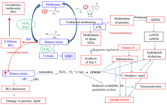 Involvement of hyperhomocysteinemia in oxidative stress and depression. ADMA—asymmetric dimethylarginine; DNA—deoxyribonucleic acid; GPx—glutathione peroxidase; GSH—reduced glutathione; HCy—homocysteine; NOS—nitroxide synthase; Om3—omega-3 fatty acids. The direction of the arrow means that one process/substance will affect another process/tissue. Modified according to [66].