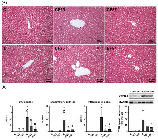 Effects of fish oil on hepatic damage markers in rats with alcohol-induced injury. (A) H&E staining (magnification ×200) (red arrows: lipid vacuoles). (B) Scores of fatty changes and inflammation (n = 5). (C) CYP2E1 protein expression (n = 6). * p < 0.05 compared to the C group by Student’s t-test. Superscript letters (A,B) indicate differences among three ethanol groups according to a one-way ANOVA with Tukey’s post hoc test (p < 0.05). C, control group; E, ethanol group; F25, 25% fish oil substituted for olive oil; F57, 57% fish oil substituted for olive oil; CYP2E1, cytochrome P450 2E1; GAPDH, glyceraldehyde 3-phosphate dehydrogenase.