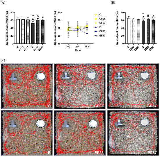 Effects of fish oil on behavioral changes in rats with chronic ethanol-induced liver damage (n = 6). (A) Spontaneous alterations in the Y maze. (B) Novel objective recognition (NOR) at the endpoint. (C) Representative images of rats’ route in the NOR test. Values are presented as the mean ± SD. ** p < 0.01 compared to the C group according to Student’s t-test. Superscript letters (A,B) indicate differences among three ethanol groups according to a one-way ANOVA with Tukey’s post hoc test (p < 0.05). C, control group; E, ethanol group; F25, 25% fish oil substitution for olive oil; F57, 57% fish oil substitution for olive oil.