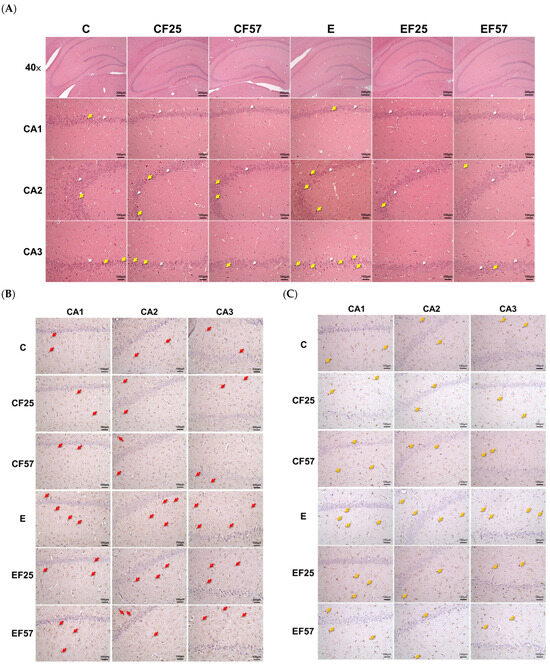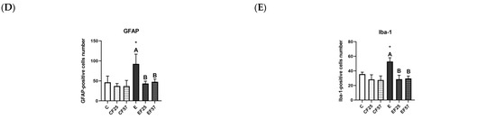 Regarding the histopathological examination of the hippocampus, the E group exhibited a greater degree of nuclear condensation in pyramidal cells within the CA1, CA2, and CA3 regions (Figure 4, C vs. E). GFAP-positive and Iba-1-positive staining appeared more frequently in the E group, indicating increased activation of astrocytes and microglia as injury markers (Figure 4B–E, C vs. E) [34]. Following fish oil administration, expressions of both GFAP and Iba-1 were reduced in the EF25 and EF57 groups (Figure 4B–E).