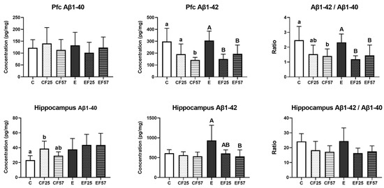 As to Aβ1-40 levels, the only notable change was higher hippocampal Aβ1-40 in the CF25 group compared to the C group. On the other hand, no significant differences in Aβ1-42 levels were observed in either the prefrontal cortex or hippocampus of the E group, although a trend toward significance was noted in the hippocampus when compared to the C group (p = 0.06, Figure 5). Both the EF25 and EF57 groups showed lower Aβ1-42 levels and ratios of Aβ1-42/Aβ1-40 compared to the E group in the prefrontal cortex, while in the hippocampus, only the EF57 group showed significantly lower Aβ1-42 levels (Figure 5, E vs. EF57).