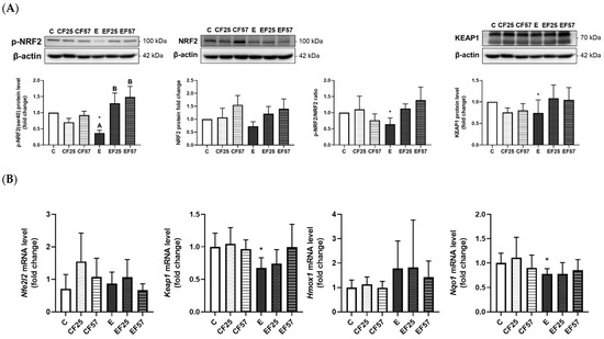 The GSH concentration and activities of antioxidant enzymes, including GPx, SOD, and CAT, significantly decreased in the E group. Among these enzymes, only CAT activity was restored in the EF25 and EF57 groups (Table 2). For the NRF2/KEAP1 pathway, protein expressions of p-NRF2 and KEAP-1 were significantly elevated in the E group, with increases in both keap1 and nqo1 mRNA levels (Figure 2). Compared to the E group, the EF25 group demonstrated significantly higher keap1 and lower nqo1 mRNA levels.