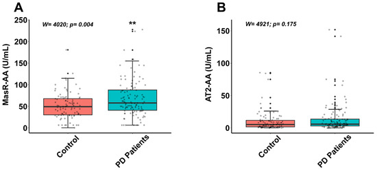 Serum levels of autoantibodies targeting components of the renin–angiotensin system in control subjects and Parkinson’s disease (PD) patients. (A) Mas receptor-activating autoantibodies (MasR-AAs) were significantly elevated in PD patients compared to controls (p = 0.004; Wilcoxon–Mann–Whitney test). (B) No significant differences were observed in the levels of angiotensin II type 2 receptor-activating autoantibodies (AT2-AA) between groups (p = 0.175; Wilcoxon–Mann–Whitney test). Data distribution is shown using a box plot, where boxes represent the interquartile range (IQR) and the median (black line), and whiskers represent ± 1.5 IQR. Each point represents an individual subject. ** p < 0.01.