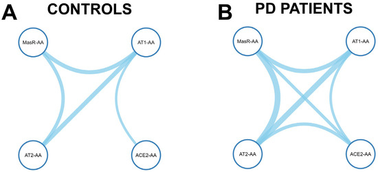 Pairwise Spearman correlation analysis among RAS-related autoantibodies revealed a denser and more integrated network in PD patients compared to healthy controls. In controls (Supplementary Table S1; Figure 2A), AT1-AAs showed moderate correlations with AT2-AAs (rs = 0.367, 95% CI: 0.173–0.533, p < 0.001) and MasR-AAs (rs = 0.341, 95% CI: 0.139–0.515, p = 0.001), while its correlation with ACE2-AAs was weaker and marginally significant (rs = 0.204, 95% CI: −0.002–0.394, p = 0.046). Additionally, a significant correlation was observed between AT2-AAs and MasR-AAs (rs = 0.288, p = 0.006). No significant associations were detected between ACE2-AAs and the other RAS components. In contrast, PD patients (Supplementary Table S2; Figure 2B) exhibited a more interconnected cluster among the four RAS-AAs (AT1-AAs, AT2-AAs, MasR-AAs, ACE2-AAs), characterized by stronger and statistically significant correlations across all pairwise comparisons. AT1-AAs were significantly associated with AT2-AAs (rs = 0.460, p < 0.001), MasR-AAs (rs = 0.355, p < 0.001), and ACE2-AAs (rs = 0.215, p = 0.020). Additionally, a significant correlation was observed between AT2-AAs and MasR-AAs (rs = 0.491, p < 0.001). Notably, correlations involving ACE2-AAs became significant only in the patient group, with positive associations with AT2-AAs (rs = 0.274, p = 0.003) and MasR-AAs (rs = 0.257, p = 0.006). These findings reflect enhanced coordination among RAS autoantibody levels in PD.