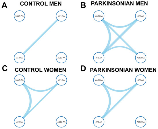 Sex-stratified Spearman correlation analysis revealed distinct RAS autoantibody interaction patterns both in controls and PD patients. Among control men (Figure 3A; Supplementary Table S3), only a single significant correlation was detected between AT1-AAs and AT2-AAs (rs = 0.396, p = 0.006), with all other pairwise interactions falling below significance thresholds. Notably, ACE2-AAs remained functionally uncoupled in this subgroup. In contrast, in control women (Figure 3C; Supplementary Table S4), AT1-AAs displayed statistically significant correlations with AT2-AAs (rs = 0.280, p = 0.049) and with MasR-AAs (rs = 0.337, p = 0.02). A more robust correlation was observed between AT2-AAs and MasR-AAs (rs = 0.488, p = 0.001). The correlation between AT1-AAs and ACE2-AAs was weaker and not statistically significant (rs = 0.183, 95% CI: −0.082–0.424, p = 0.161), and no significant associations were found between ACE2-AAs and the remaining RAS components. Parkinsonian men (Figure 3B; Supplementary Table S5) presented a markedly integrated RAS autoantibody network. Strong correlations were observed between AT1-AAs and AT2-AAs (rs= 0.494, p < 0.001), AT1-AAs and MasR-AAs (rs = 0.370, p = 0.005), ACE2-AAs and AT2-AAs (rs = 0.317, p = 0.017), and ACE2-AAs and MasR-AAs (rs = 0.352, p = 0.008). Additionally, a significant correlation was observed between AT2-AAs and MasR-AAs (rs = 0.492, p < 0.001). This pattern reflects a coordinated upregulation of RAS elements, indicative of an altered regulatory state associated with the man PD phenotype. In parkinsonian women (Figure 3D; Supplementary Table S6), the RAS network was more similar to controls than in the case of men. Significant interactions were noted between AT1-AAs and AT2-AAs (rs = 0.425, p = 0.001) and between AT1-AAs and MasR-AAs (rs = 0.358, p = 0.005), whereas ACE2-AAs remained marginally correlated with AT2-AAs (rs = 0.255, p = 0.051) and not significantly associated with MasR-AAs. Additionally, a more robust correlation was observed between AT2-AAs and MasR-AAs (rs = 0.472, p < 0.001), suggesting a reinforced coupling between these two protective RAS receptors in the control women as compared with control men.