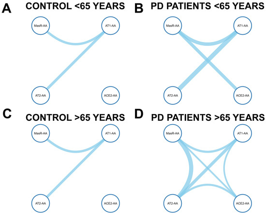 In controls under 65 years of age (Figure 4A; Supplementary Table S7), a sparsely connected network was observed. The only significant correlations involved AT1-AAs and AT2-AAs (rs = 0.362, p = 0.010), and AT1-AAs and MasR-AAs (rs = 0.319, p = 0.029). No correlations involving ACE2-AAs reached statistical significance. In over-65-year controls, following the same pattern as in the under-65-year control group, the network remained sparse (Figure 4C; Supplementary Table S8). Only significant correlations were found between AT1-AAs and AT2-AAs (rs = 0.335, p = 0.025), and between AT1-AAs and MasR-AAs (rs = 0.317, p = 0.038). ACE2-AAs were not significantly correlated with any of the other markers. In contrast, PD patients under 65 years (Figure 4B; Supplementary Table S9) exhibited a more interconnected RAS network, with AT1-AAs significantly associated with AT2-AAs (rs = 0.593, p < 0.001) and MasR-AAs (rs = 0.473, p = 0.006), and MasR-AAs significantly associated with ACE2-AAs (rs = 0.427, p = 0.015). Although the correlation between AT1-AAs and ACE2-AAs did not reach statistical significance (rs = 0.320, p = 0.070), it showed a trend toward positive association. PD patients older than 65 years (Figure 4D; Supplementary Table S10) showed a more integrated and dense correlation network. Significant correlations were observed between AT1-AAs and AT2-AAs (rs = 0.411, p < 0.001), AT1-AAs and MasR-AAs (rs = 0.295, p = 0.007), as well as between ACE2-AAs and AT2-AAs (rs = 0.270, p = 0.013) and MasR-AAs (rs = 0.225, p = 0.041). AT1-AA and ACE2-AA correlation, although weaker, was statistically significant (rs = 0.216, p = 0.049). Additionally, a significant correlation was observed between AT2-AAs and MasR-AAs (rs = 0.57, p < 0.001).