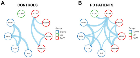 Integrated correlation networks of RAS autoantibodies, cytokines, and oxidative stress markers in healthy controls (A) and Parkinson’s disease (PD) patients (B). Nodes represent RAS autoantibodies (red), cytokines (blue), and 27-OHC (green). Edges show significant correlations (p < 0.05), with thickness indicating strength (rs). Controls showed two loosely connected modules (RAS and cytokines), while the PD network was more integrated, with AT1-AA as a central hub linking immune, oxidative, and RAS pathways.