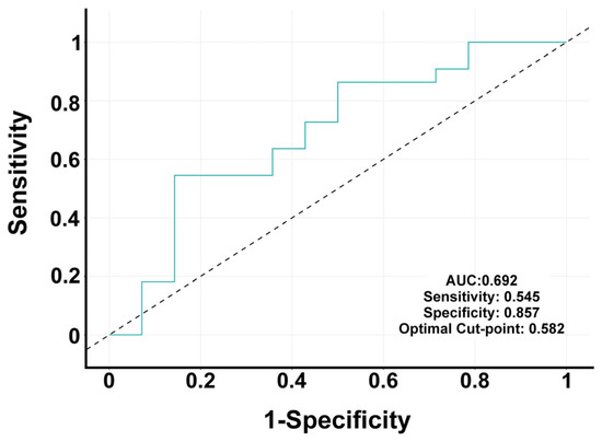 Receiver operating characteristic (ROC) curve evaluating the diagnostic performance of the model for classifying PD patients. The ROC curve illustrates the trade-off between sensitivity and specificity across different threshold values. The area under the curve (AUC) was 0.692, indicating moderate discriminative ability. At the optimal cutoff point of 0.582, the sensitivity was 0.545 and the specificity was 0.857. These results suggest that the marker provides high specificity but limited sensitivity in distinguishing between groups.
