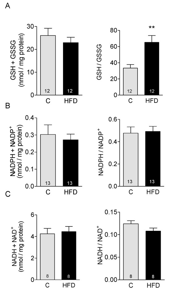 3.4. Effect of HFD on Redox Buffers in Cardiac Tissue