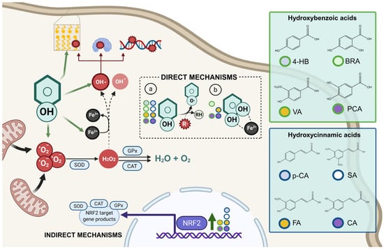 The diverse structures within the phenolic acid family are crucial in determining their activity within the organism [,]. Specifically, the number and position of hydroxyl groups have been identified as determinant factors of their antioxidant capacity [,,], enabling them to directly interact with free radicals via single-electron transfer or hydrogen-atom transfer [] or indirectly inducing the expression of endogenous enzymes with an antioxidant effect [] (Figure 1). Additionally, phenolic acids can inhibit the production of pro-inflammatory cytokines and modulate signaling pathways present during the inflammatory response (i.e., NF- κB pathway) [,,,]. They can also interfere with pathogen activity by acidifying the cytoplasm [,], inhibit enzymes such as cyclooxygenases [,,], interact with different receptors modulating their expression, like increasing the expression of the GLUT-2 insulin receptors [], and even act as bypass molecules in certain metabolic deficiencies (i.e., primary coenzyme Q deficiency) (Figure 2) []. Consequently, different phenolic acids exhibit a range of biological activities (Table 1).