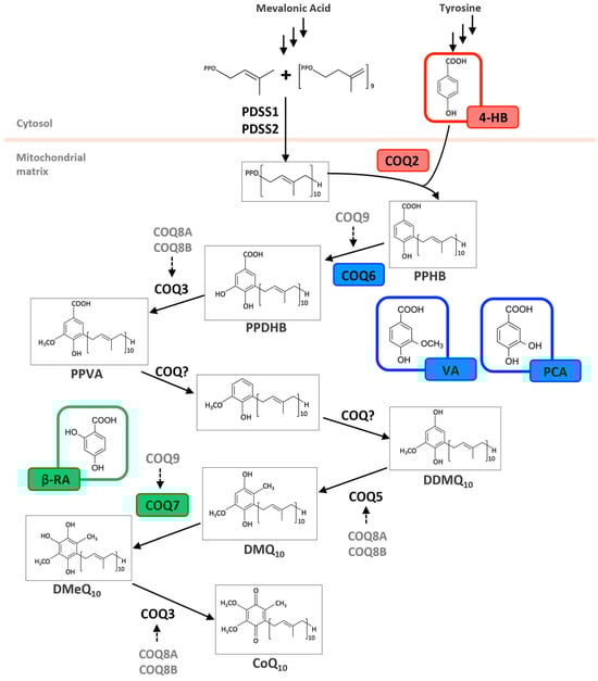 - Guerra, R.M.; Pagliarini, D.J. Coenzyme Q biochemistry and biosynthesis. Trends Biochem. Sci. 2023, 48, 463–476. [Google Scholar] [CrossRef]
