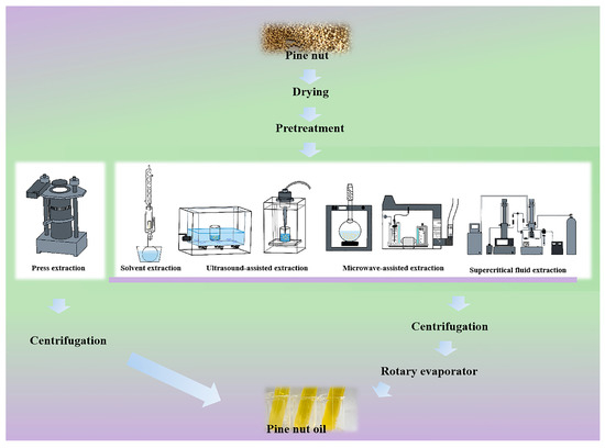Despite the growing use of fatty acids in food production [13], PNO remains susceptible to chemical and microbiological contamination, as well as risks of lipid peroxidation similar to those of pecans, red meat, and certain fish [14,15,16]. Additionally, hazardous by-products may be generated during processing [17]. Even under regulated processing and storage conditions, these risks are difficult to eliminate entirely [18,19], which limits the scope of PNO applications in the food industry [20,21]. Current research primarily focuses on the FA composition of PNO and its health effects, while insufficient attention has been given to the quality control of PNO during processing. In contrast, this review systematically examines advanced extraction techniques aimed at improving PNO quality (Figure 1) and explores novel technologies to reduce PNO oxidation.