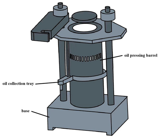 Pressing is a solvent-free oil extraction technology [55,60]. It is classified into cold pressing and hot pressing. Cold-pressed edible oils are obtained through mechanical means, such as helical or hydraulic presses, at room temperature [61]. A hydraulic pressing apparatus is illustrated in Figure 3. In contrast, hot pressing increases oil yield by heating pretreated raw materials. Notably, although high temperatures can rapidly disrupt cell walls and reduce oil viscosity, hot pressing may trigger lipolysis and oxidation reactions. These reactions result in higher levels of free FA and peroxides, which significantly differ from those produced during cold pressing [55,62]. Despite differences in processing, both cold-pressed and hot-pressed oils meet the hygienic standards for edible vegetable oils in China, as indicated by their AV and PV [52]. Cold-pressed PNO is rich in tocopherols, polyphenols, and essential FAs. Its PV (0.50~0.79 mmol/kg) is significantly lower than that of solvent-extracted PNO (2.99~3.29 mmol/kg) [60,62]. These findings are consistent with colorimetric analysis, in which the b* values (yellow–blue axis) of pressed oils ranged from 23.47 to 30.34. The L* values (lightness) ranged from 92.24 to 96.04, which were higher than those of solvent-extracted oils (80.82 to 86.53), indicating that pressed oils had greater brightness. The reduction in L* values caused by oxidation is more pronounced in solvent-extracted oils [23]. From a nutritional and physiological perspective, cold-pressed oils are preferred over refined oils [63]. However, their oil yield is usually below 70% [54,57], resulting in a high residual oil content in the press cake, which limits their commercial viability. Nevertheless, cold pressing eliminates the need for energy-intensive solvent treatment and significantly reduces the environmental impact [58]. Therefore, it is considered a preferred method for PNO extraction in resource-constrained regions [55].