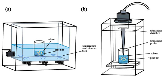 Ultrasonic bath (a) and ultrasonic probe (b). (Important parameters affecting the yield of PNO are the sonication power, the solvent-to-sample ratio, and the extraction temperature).